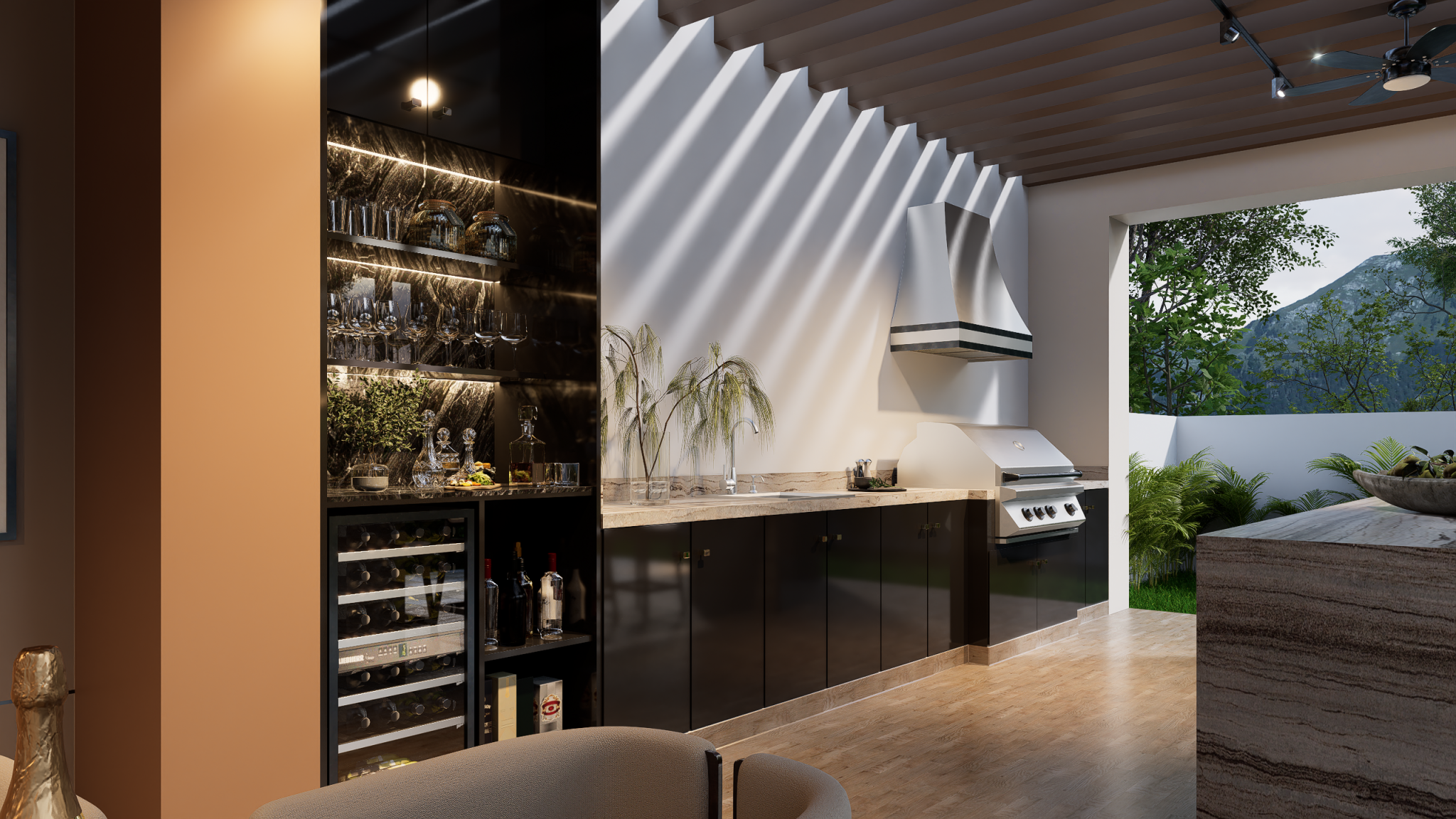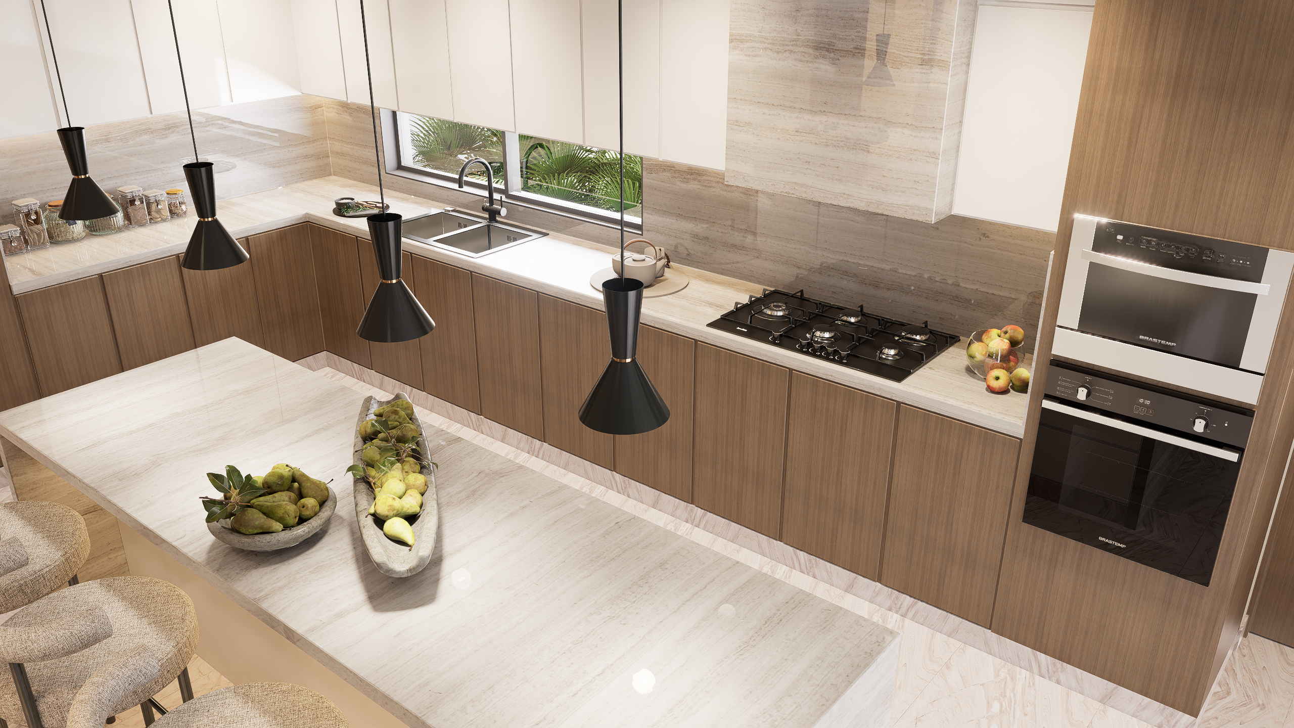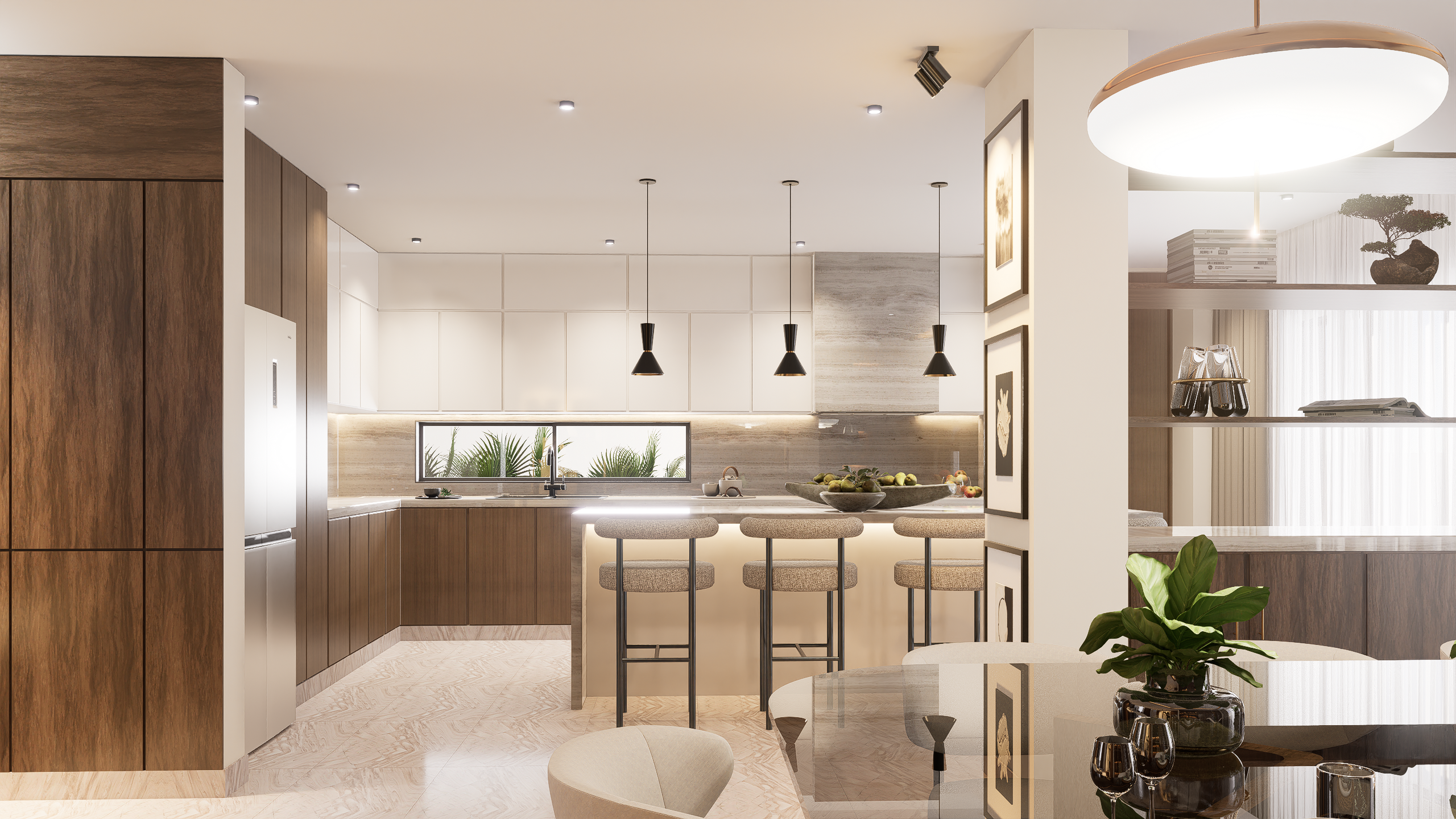 COCINA C & A COCINA C & A Para la cocina caliente se presenta un diseño moderno y minimalista, con tonos neutros y cálidos. Predomina la madera clara, que aporta calidez, y el mobiliario integrado refuerza la estética contemporánea. Una isla central funciona como barra desayunadora, co