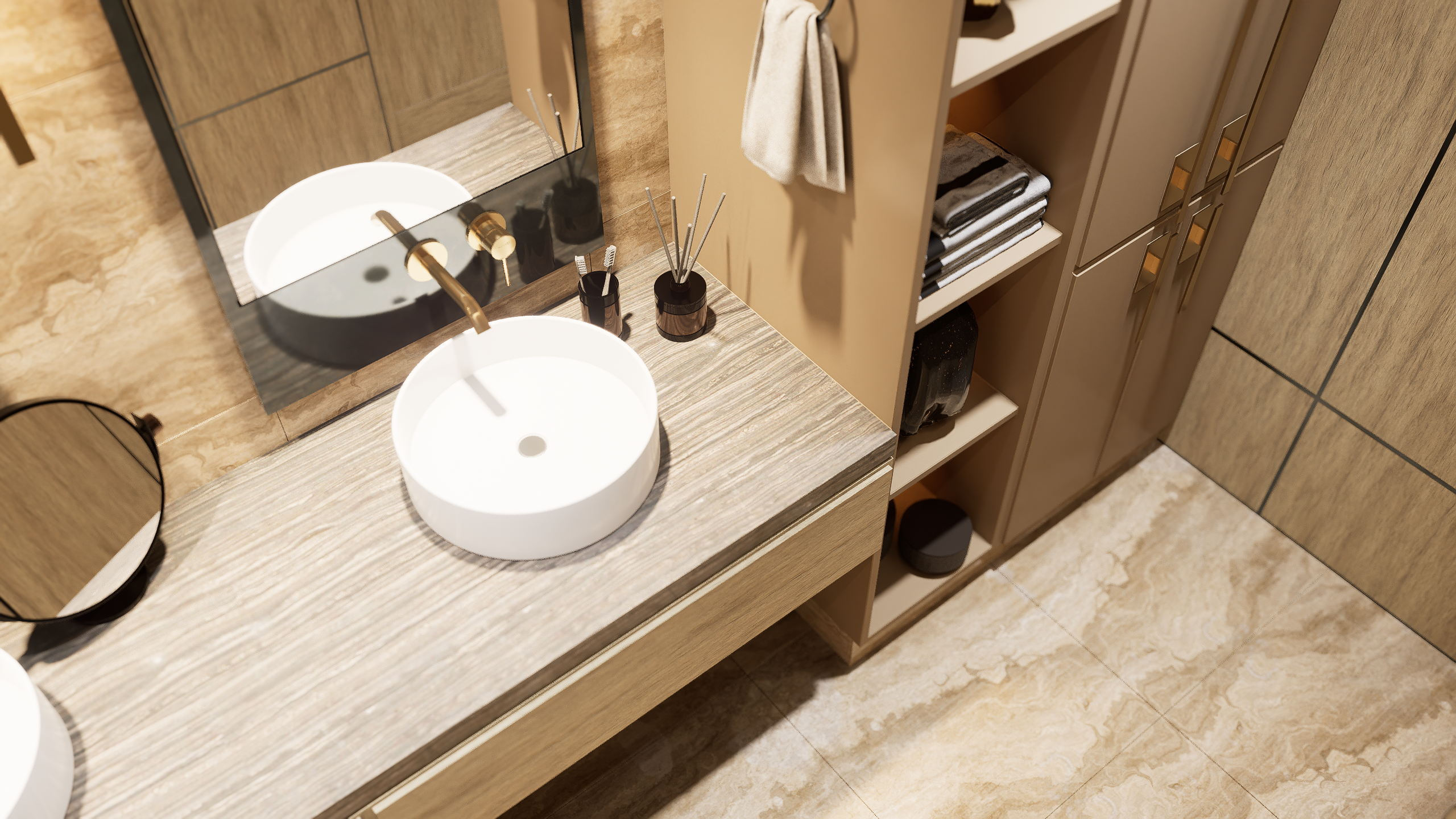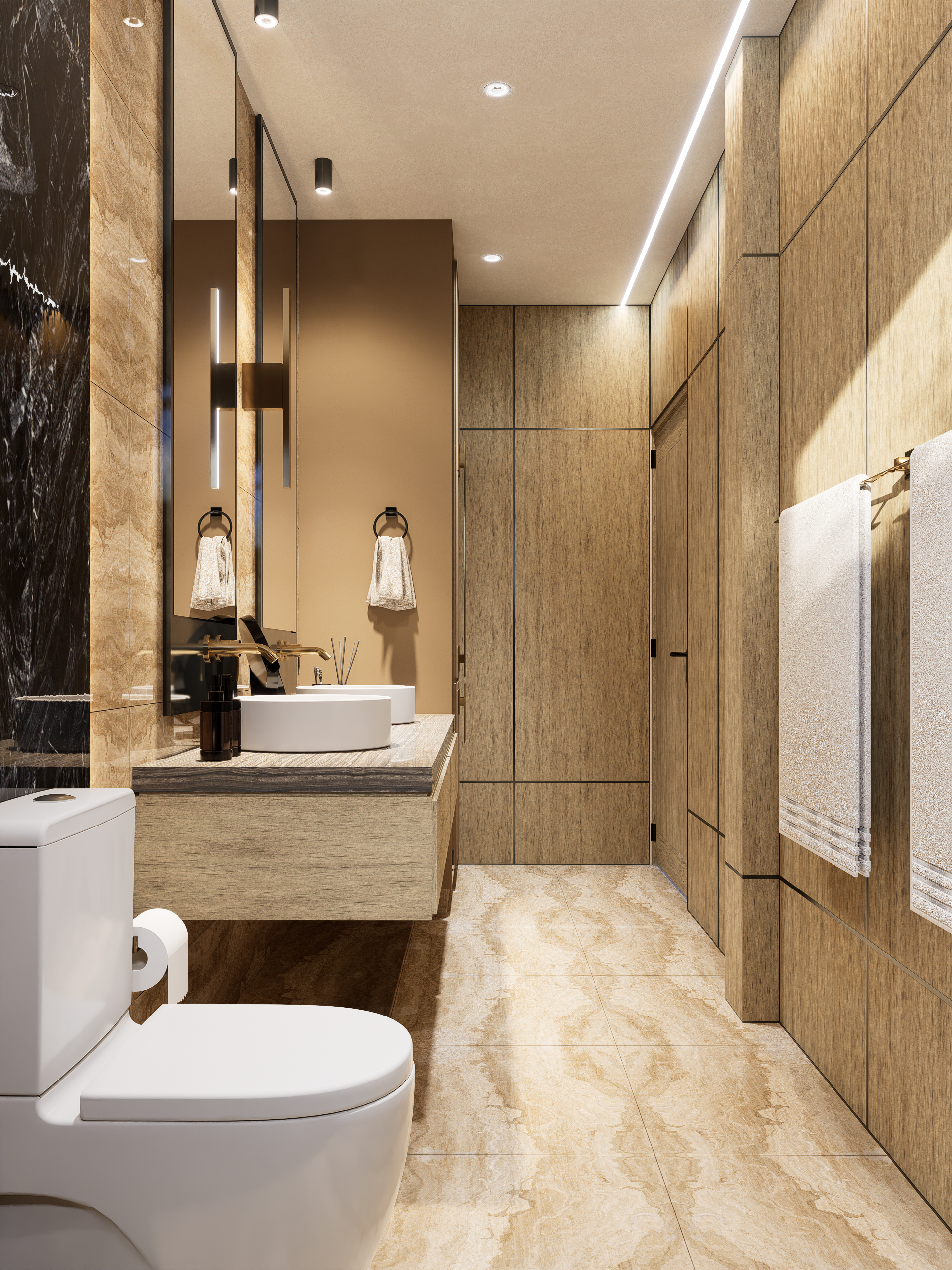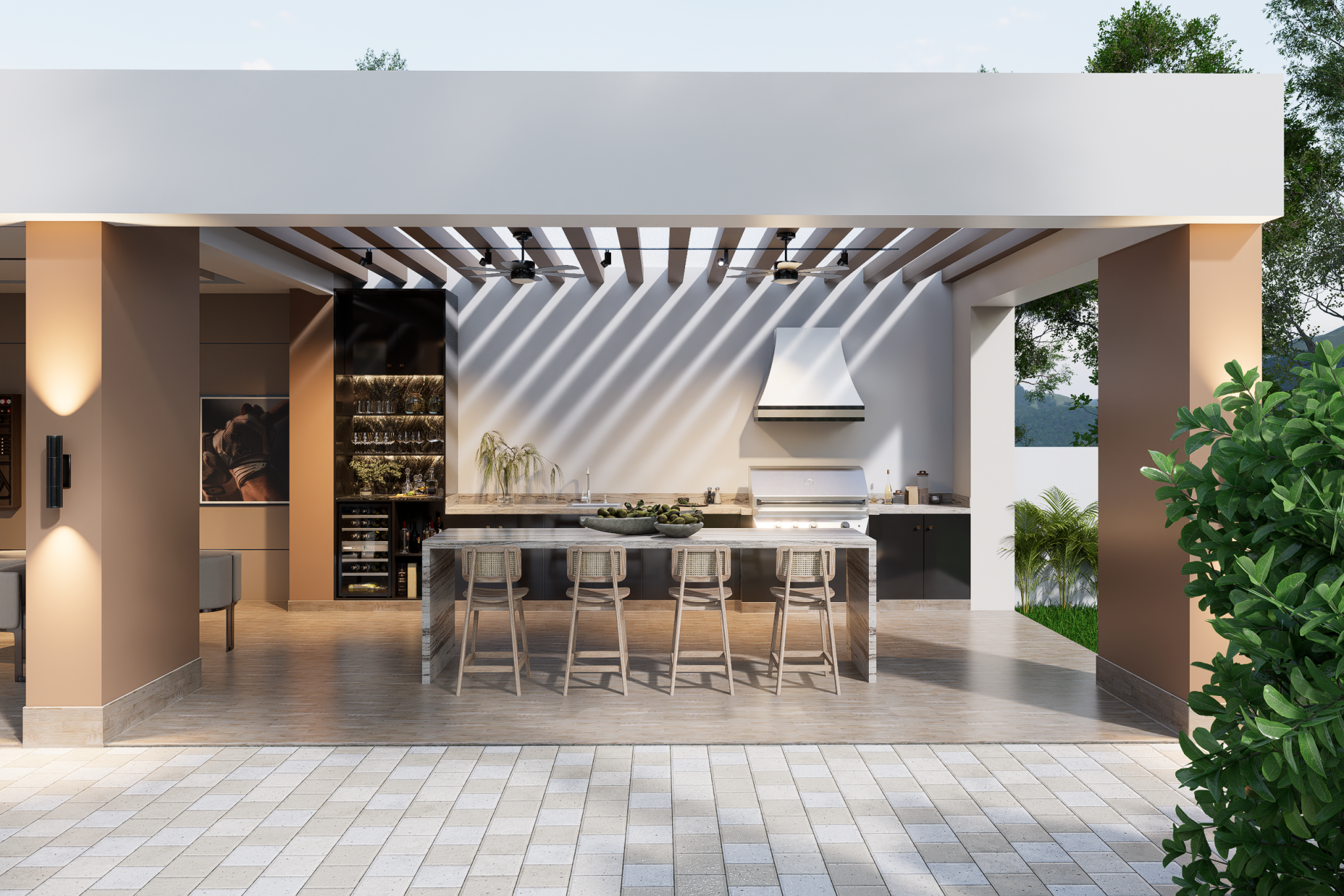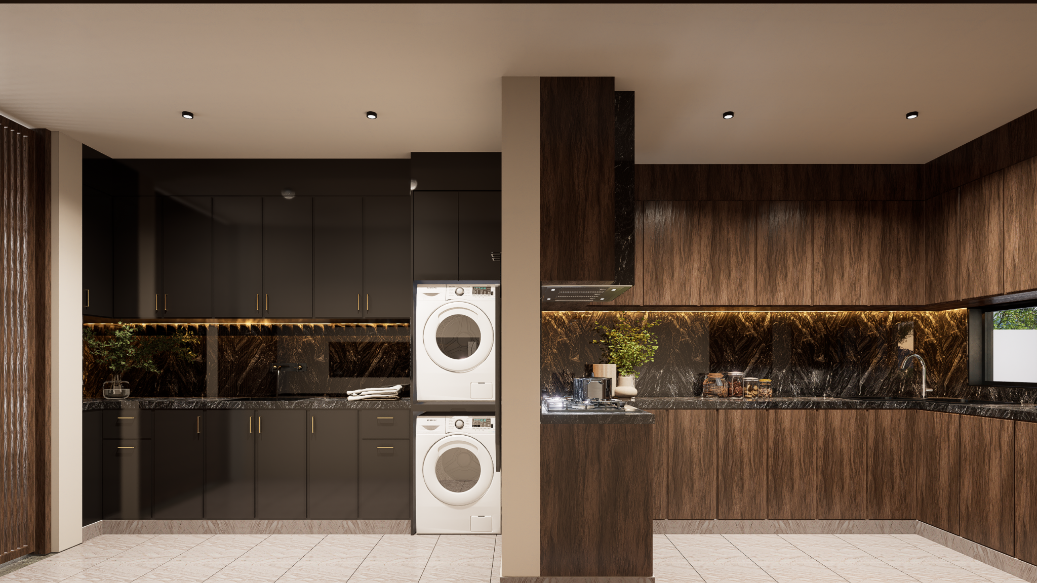 COCINA C & A COCINA C & A Para la cocina caliente se presenta un diseño moderno y minimalista, con tonos neutros y cálidos. Predomina la madera clara, que aporta calidez, y el mobiliario integrado refuerza la estética contemporánea. Una isla central funciona como barra desayunadora, co