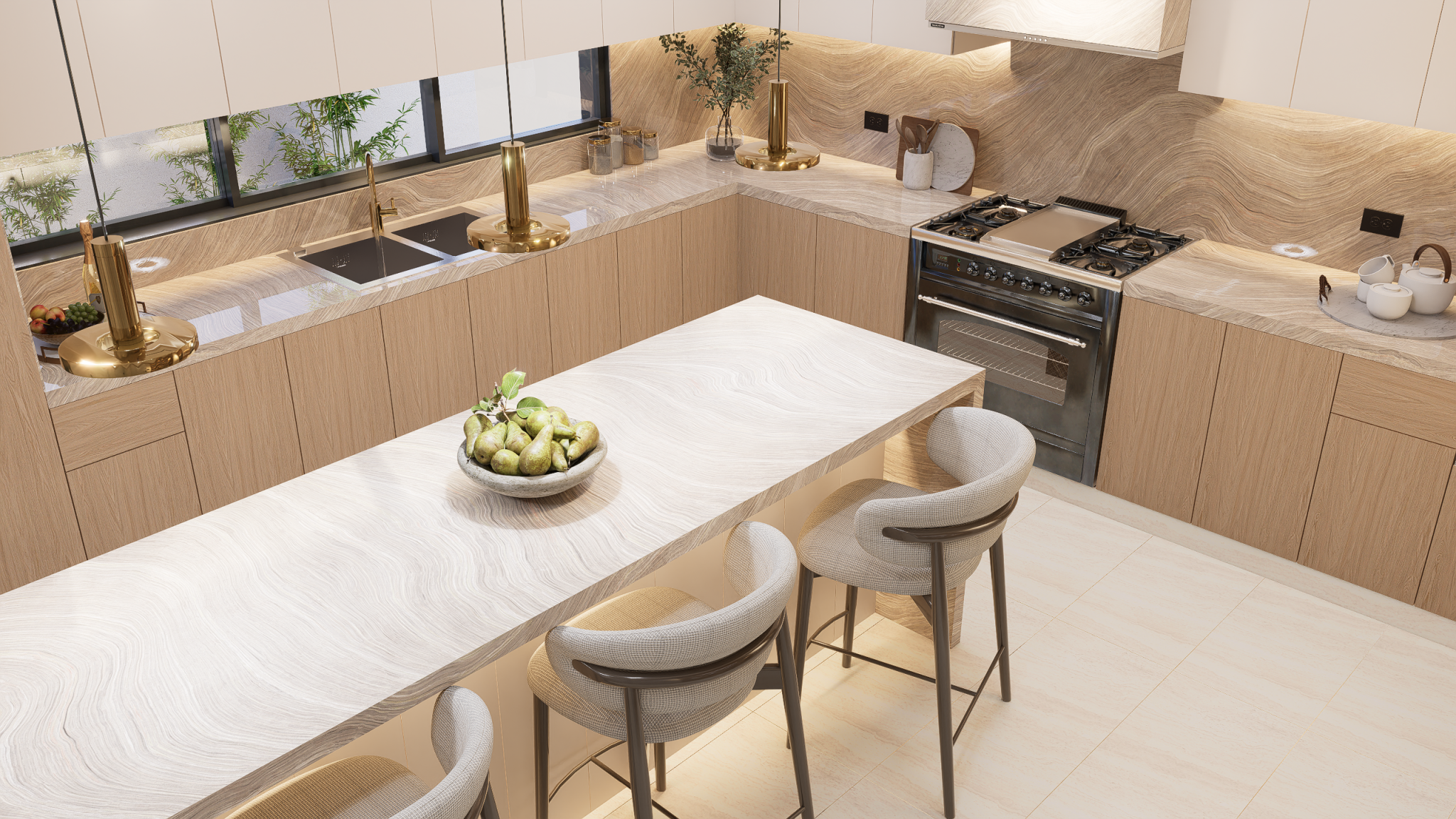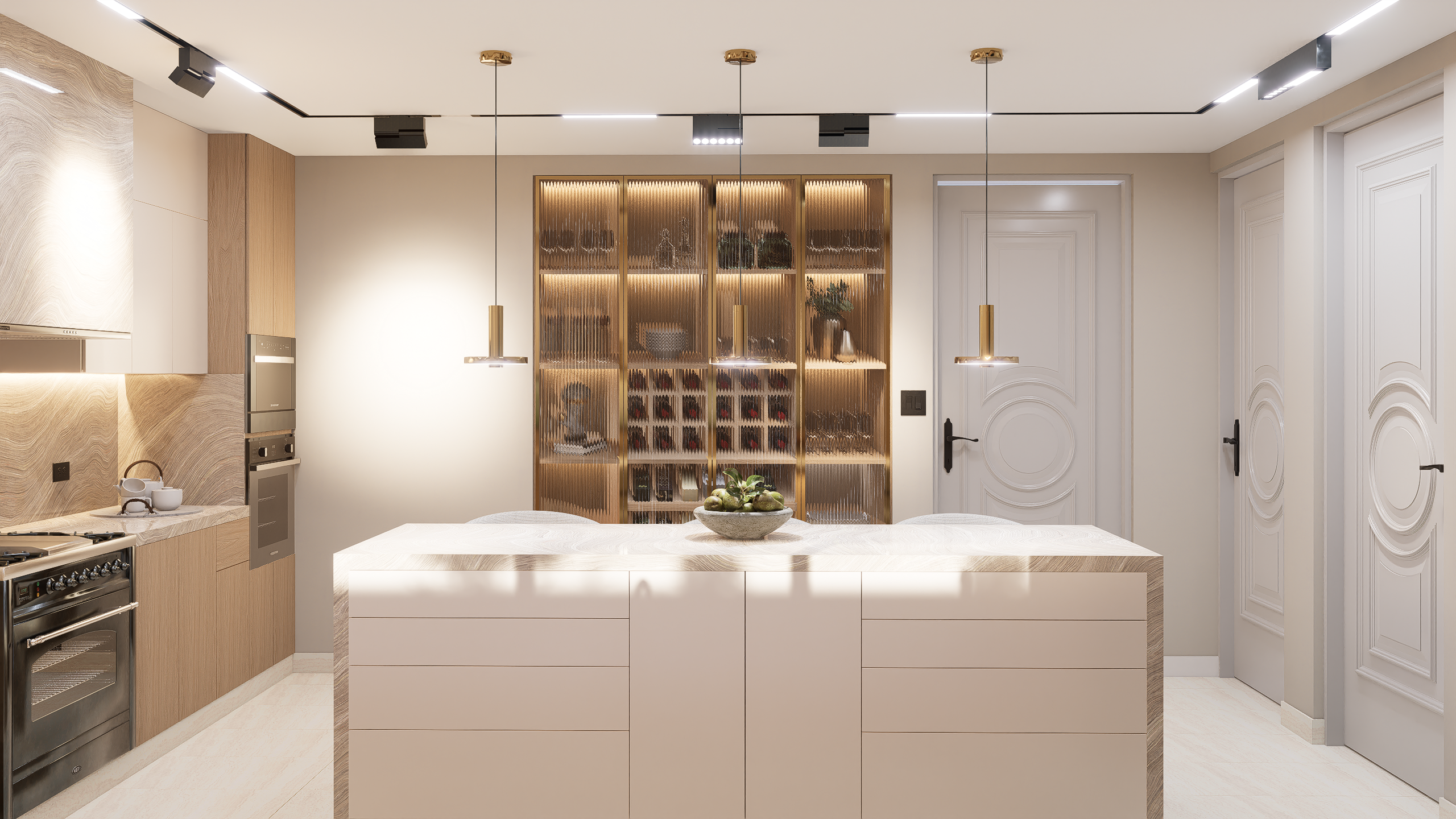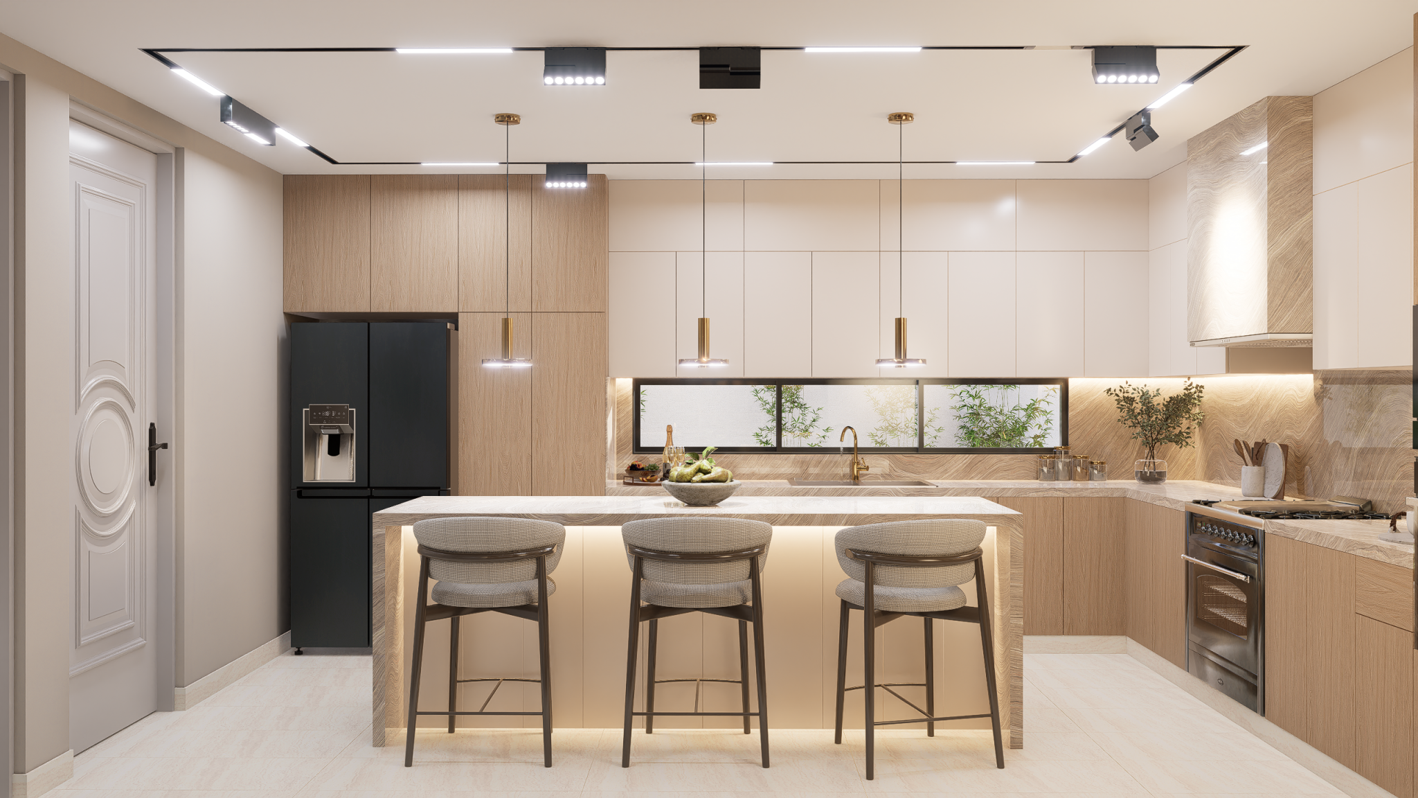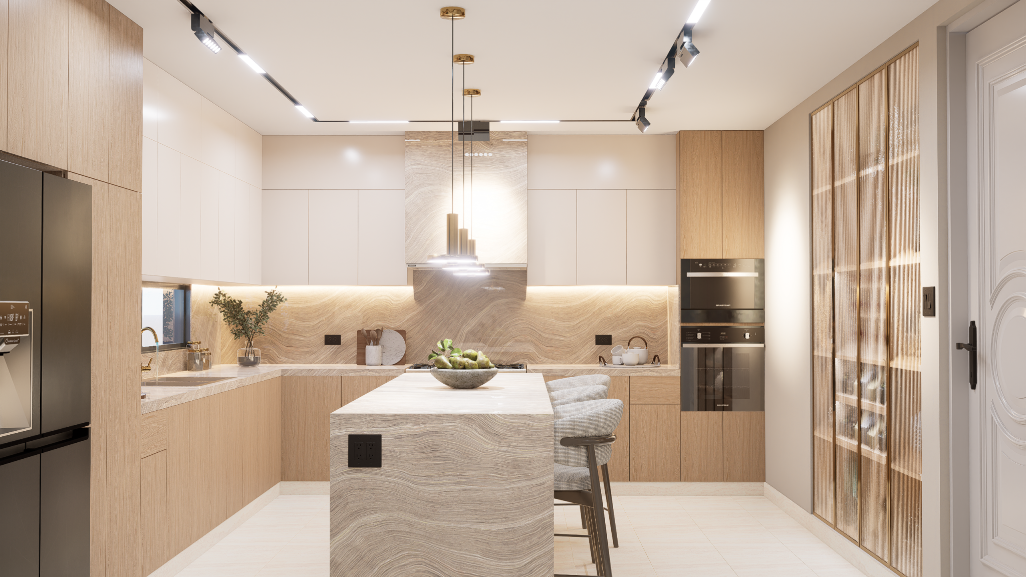 Para la cocina caliente se presenta un diseño moderno y minimalista, con tonos neutros y cálidos. Predomina la madera clara, que aporta calidez, y el mobiliario integrado refuerza la estética contemporánea. Una isla central funciona como barra desayunadora, con sillas altas y lámparas colgantes en tono dorado que aportan estilo y funcionalidad. La encimera en cuarzo color crema añade sofisticación. La zona de cocción incluye un mueble con hornos empotrado, una campana revestida también en cuarzo. La iluminación LED bajo los gabinetes mejora la funcionalidad y aporta el ambiente. Por ultimo, para la entrada de luz y ventilación natural se ha colocado un ventanal horizontal que introduce frescura y permite visualizar el exterior.