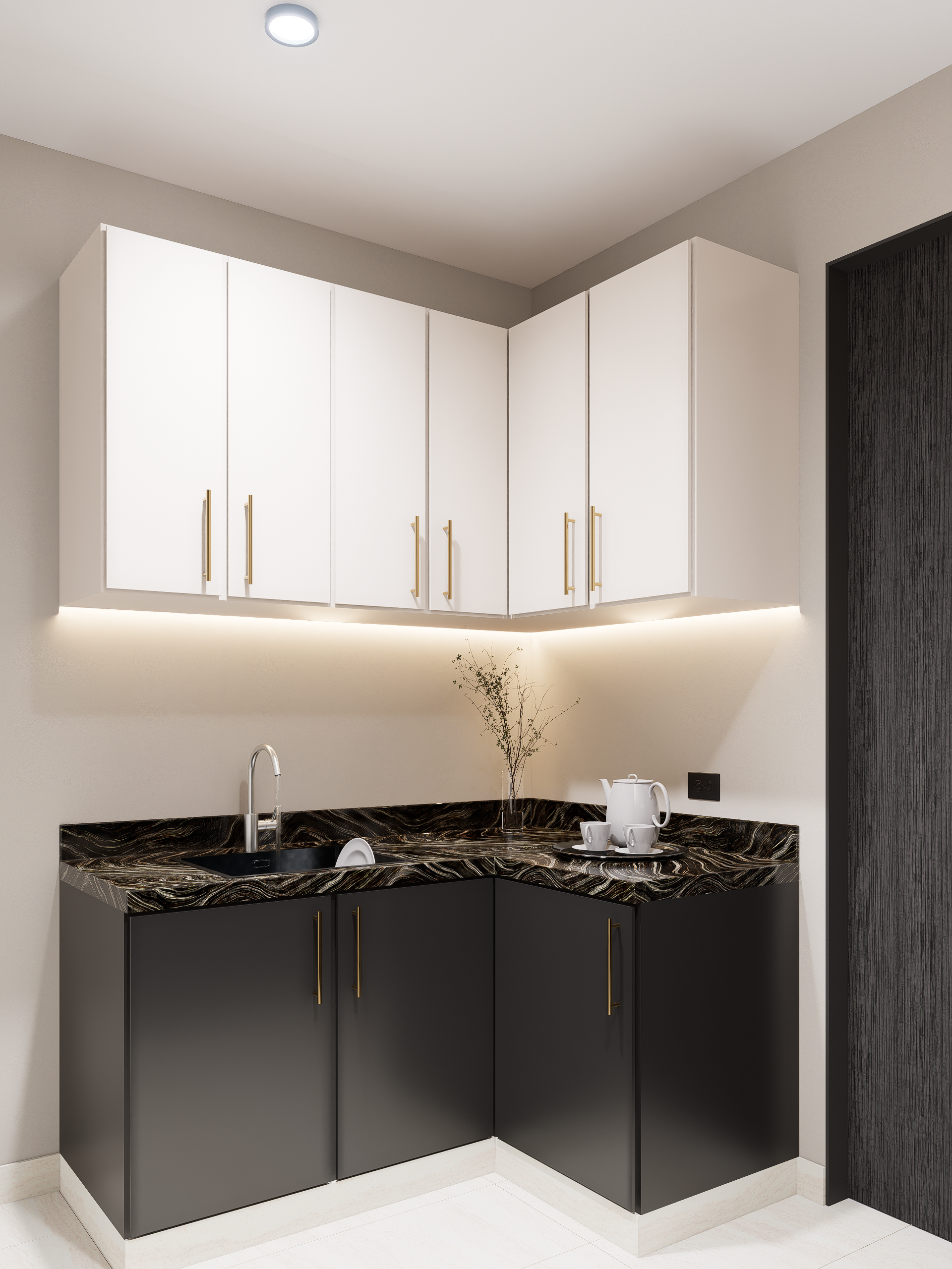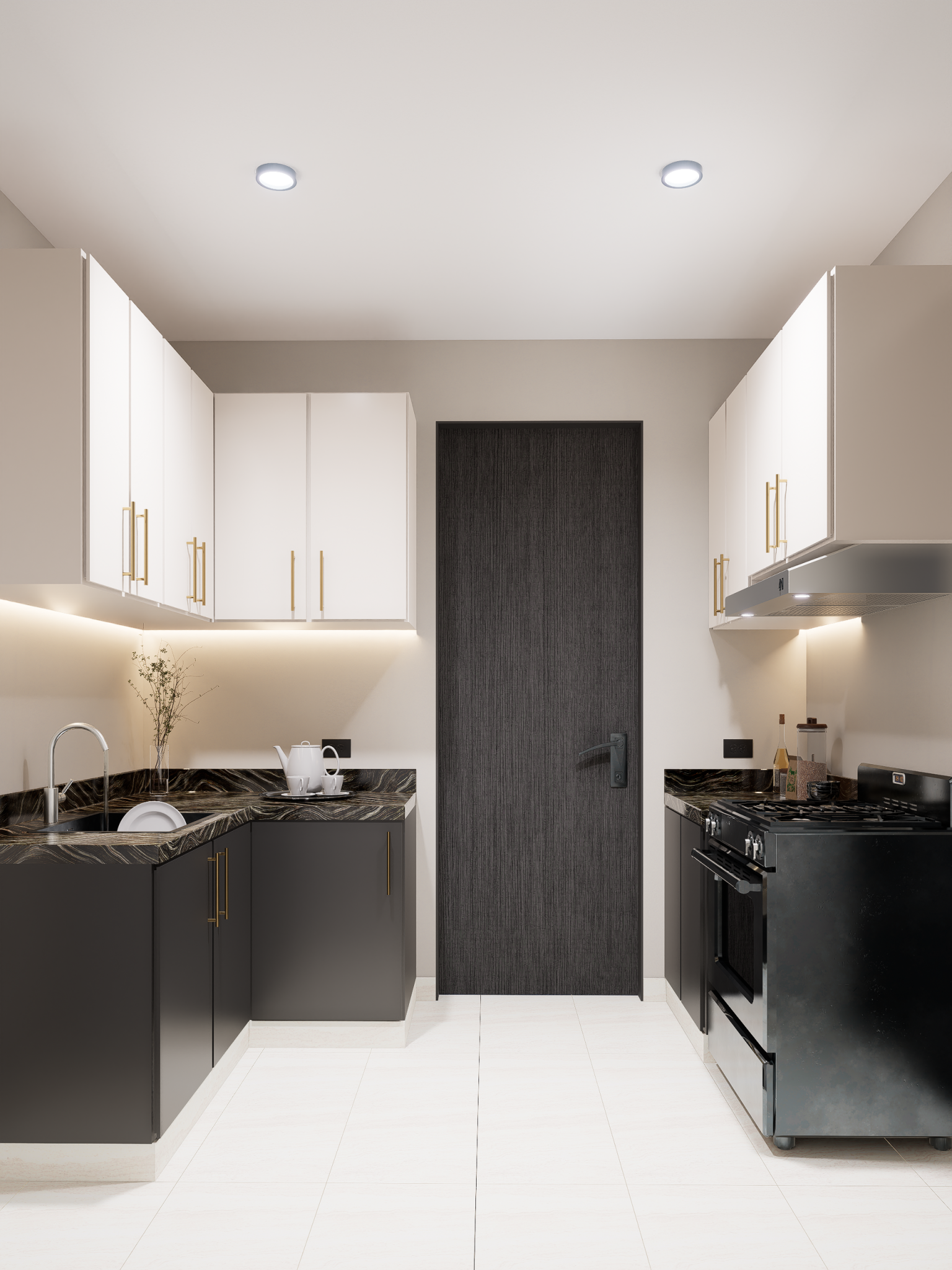 Los gabinetes inferiores, en negro con tiradores dorados, contrastan armónicamente con los superiores en un tono gris cálido, aportando equilibrio visual. Las encimeras de granito negro refuerzan la coherencia del conjunto. A pesar de su tamaño compacto, la distribución del espacio está cuidadosamente pensada para permitir una preparación de alimentos eficiente y ordenada.