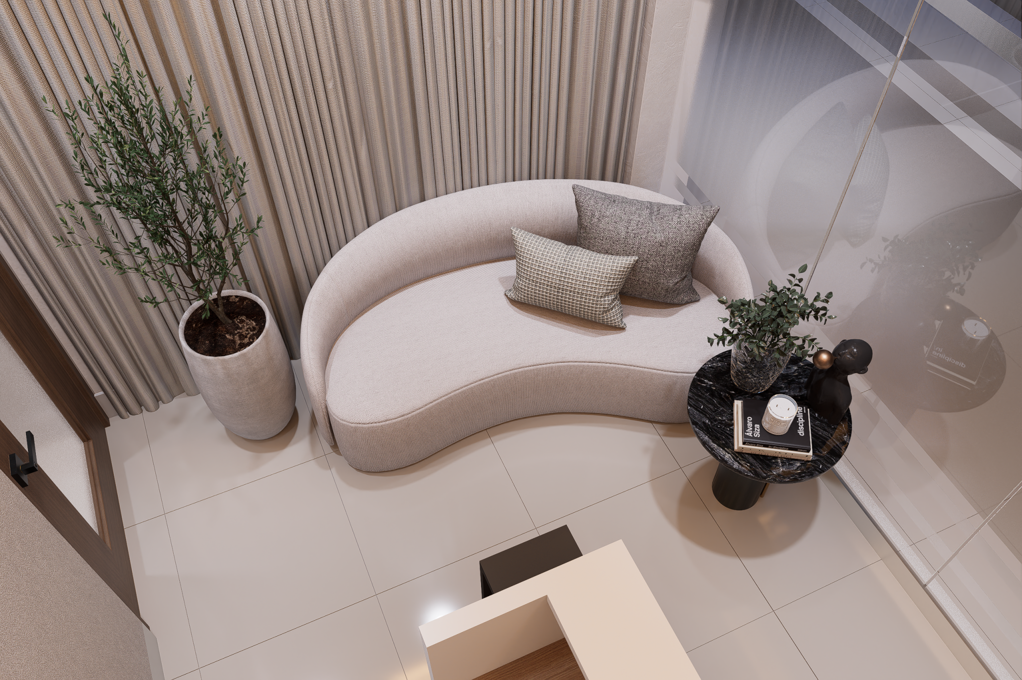 En cuanto al mobiliario, se han seleccionado piezas de formas curvas, especialmente en la recepción, evocando una sinfonía visual de lujo y estilo.