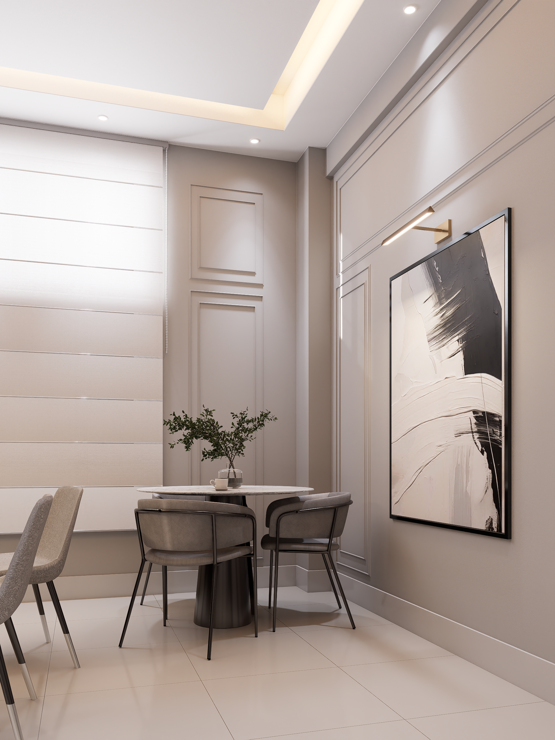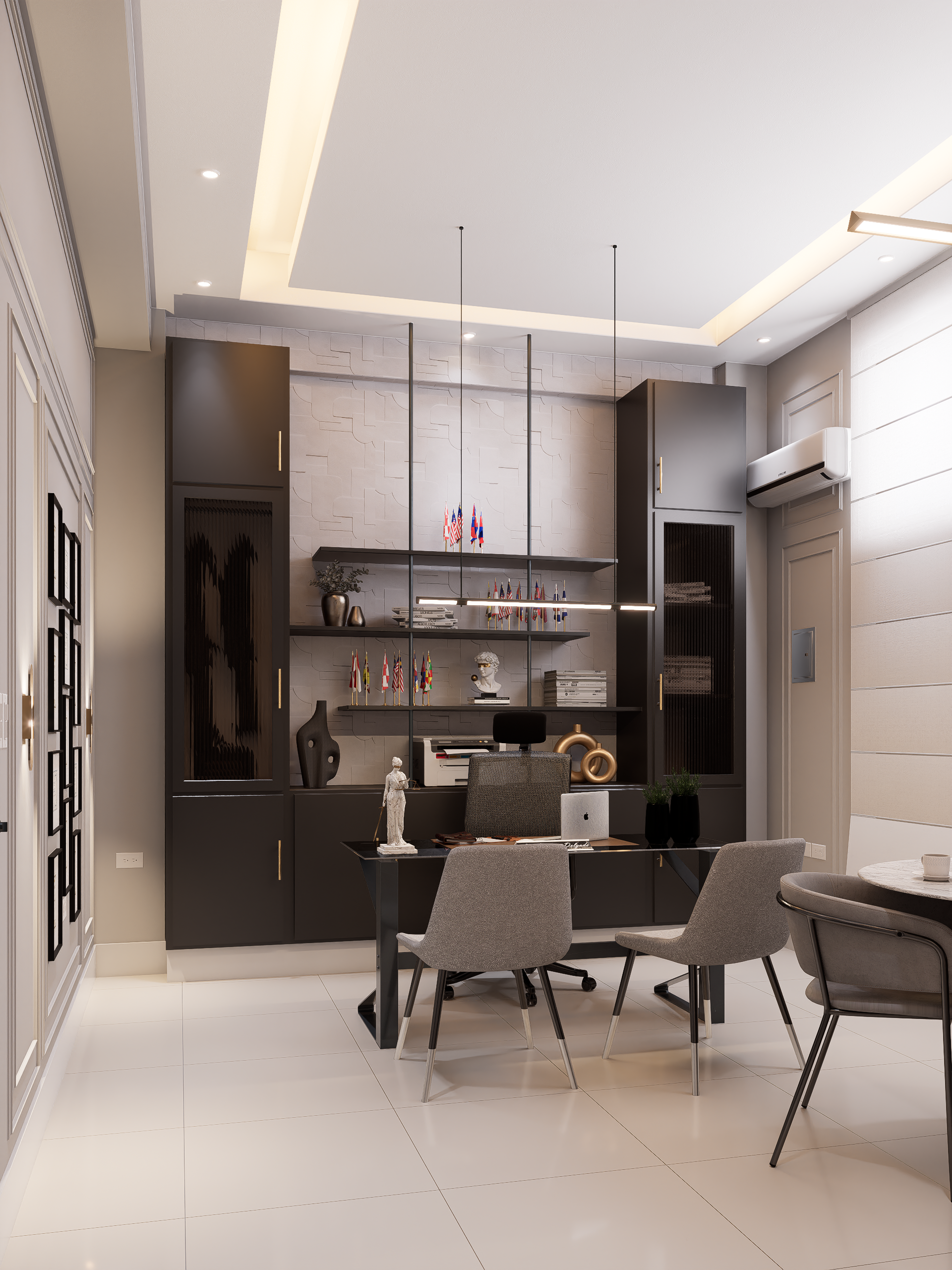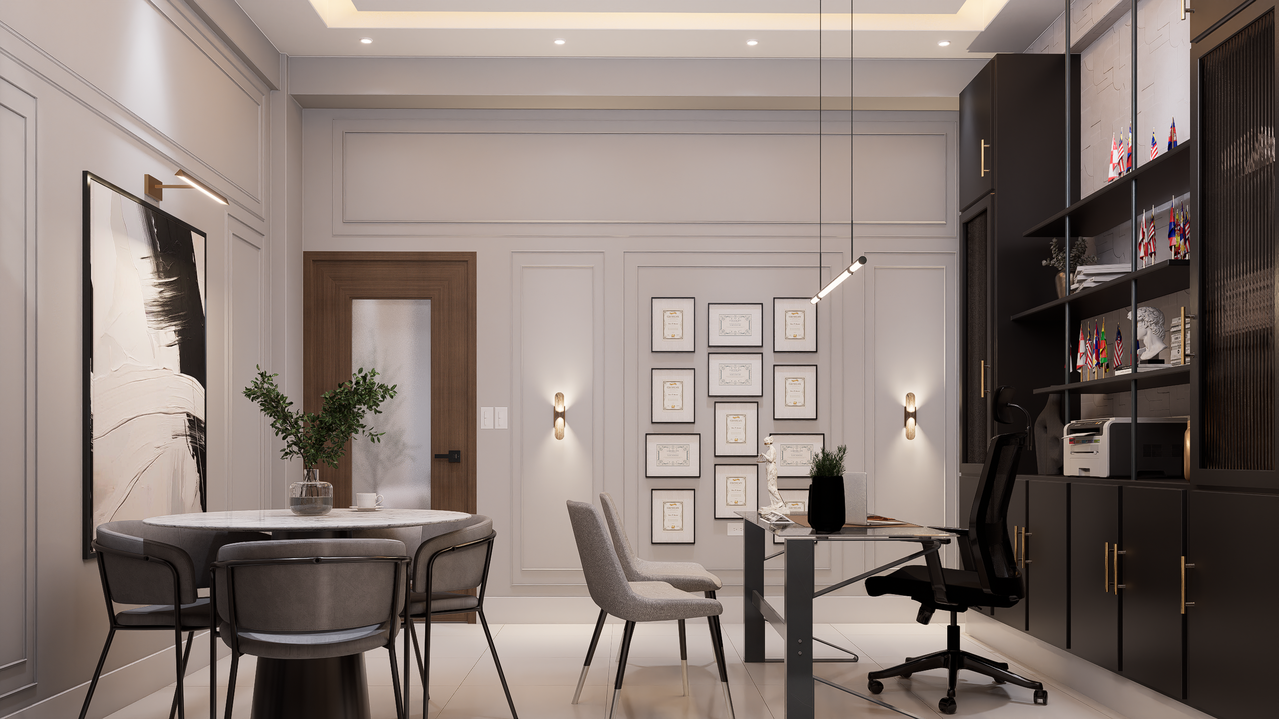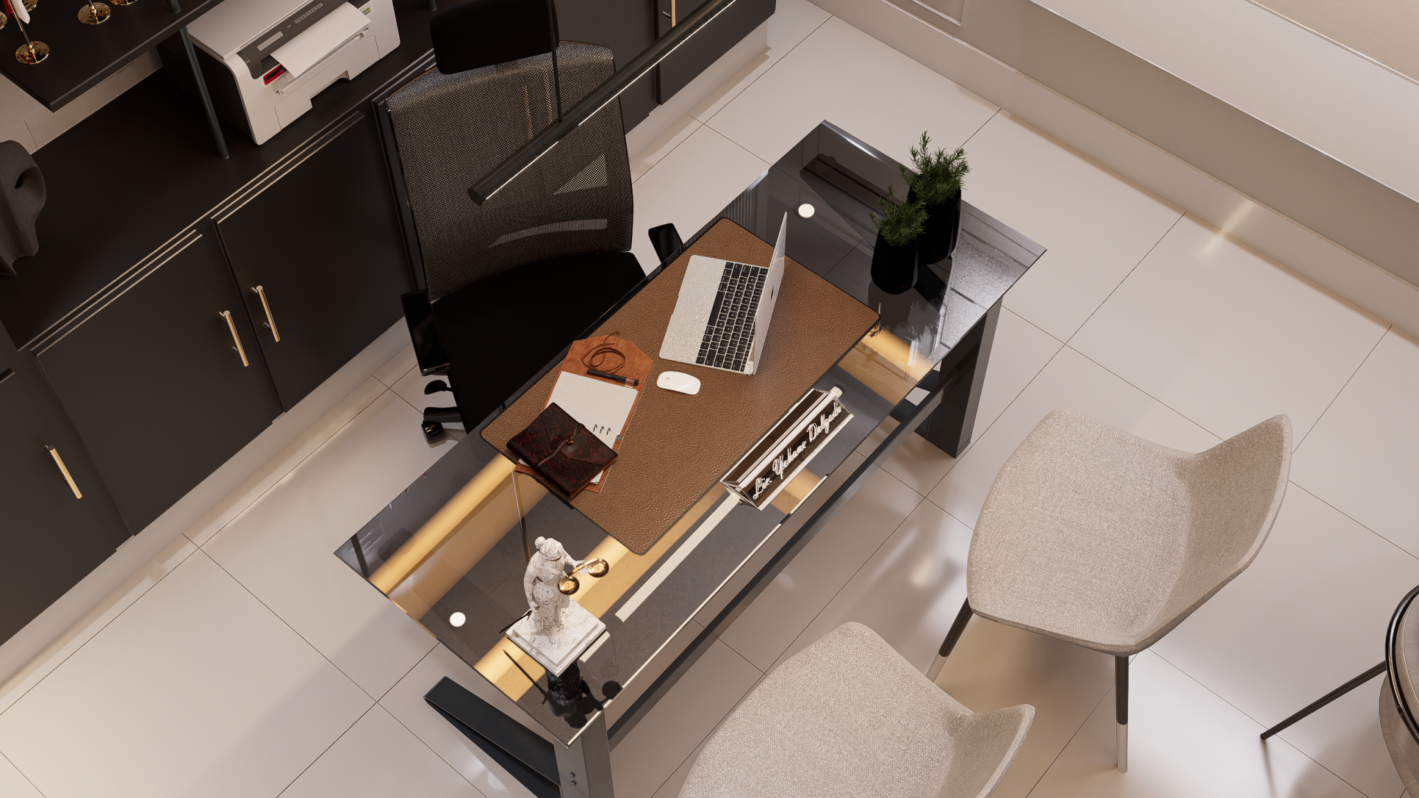 La recepción y el área de oficinas se presentan con una paleta de colores sofisticada, donde predominan el negro, el blanco y el gris, complementados con sutiles tonos metálicos que aportan un aire de elegancia y distinción a todo el ambiente.