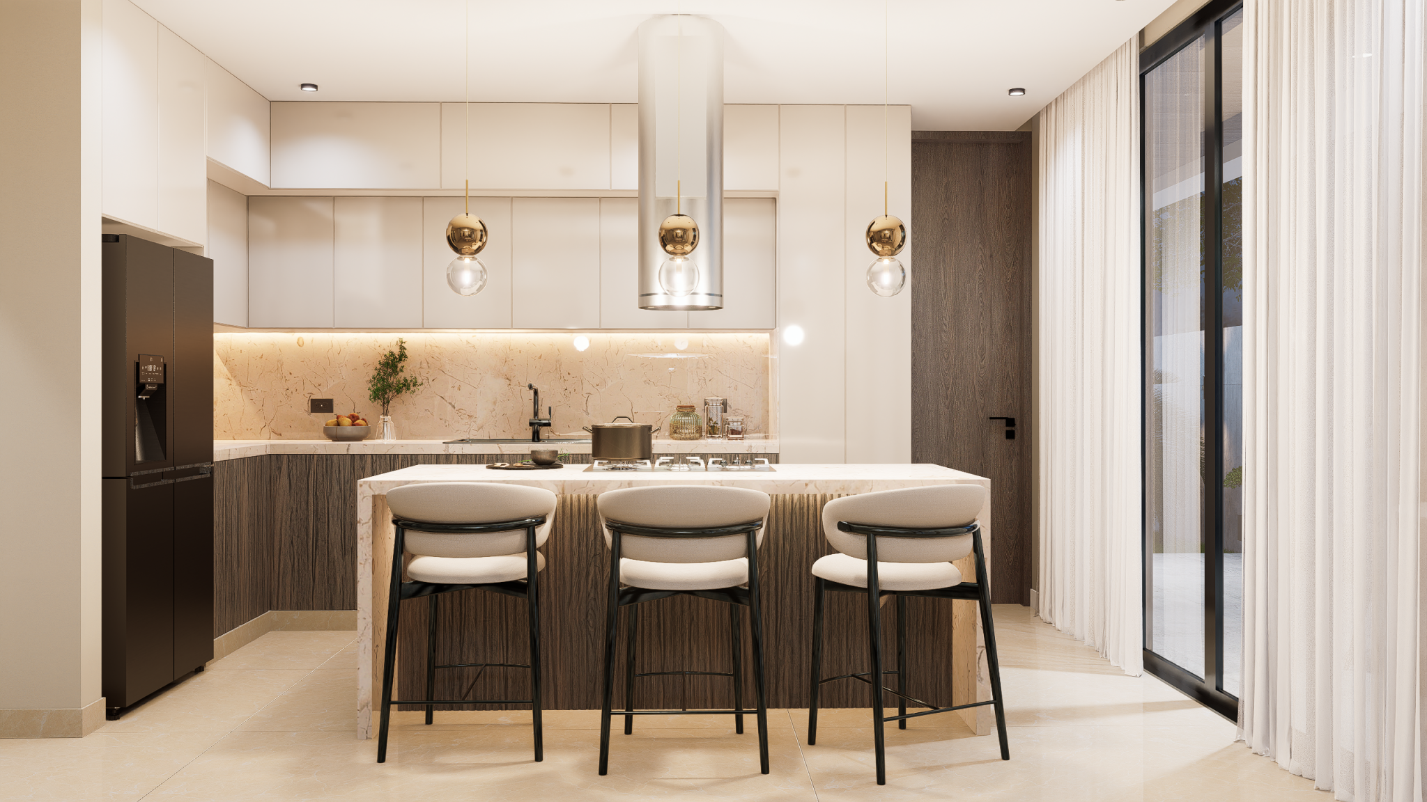 COCINA C & A COCINA C & A Para la cocina caliente se presenta un diseño moderno y minimalista, con tonos neutros y cálidos. Predomina la madera clara, que aporta calidez, y el mobiliario integrado refuerza la estética contemporánea. Una isla central funciona como barra desayunadora, co