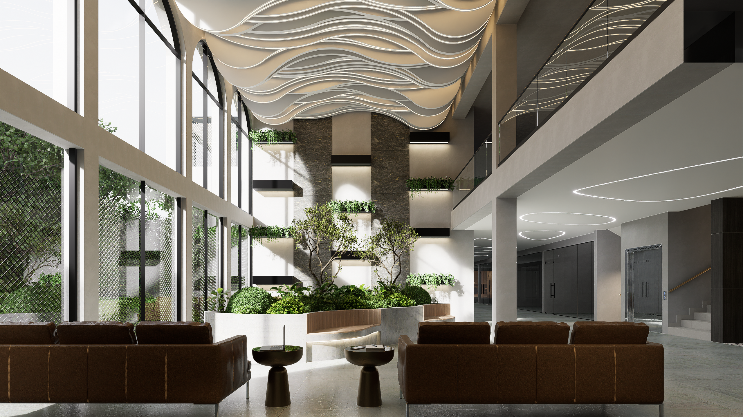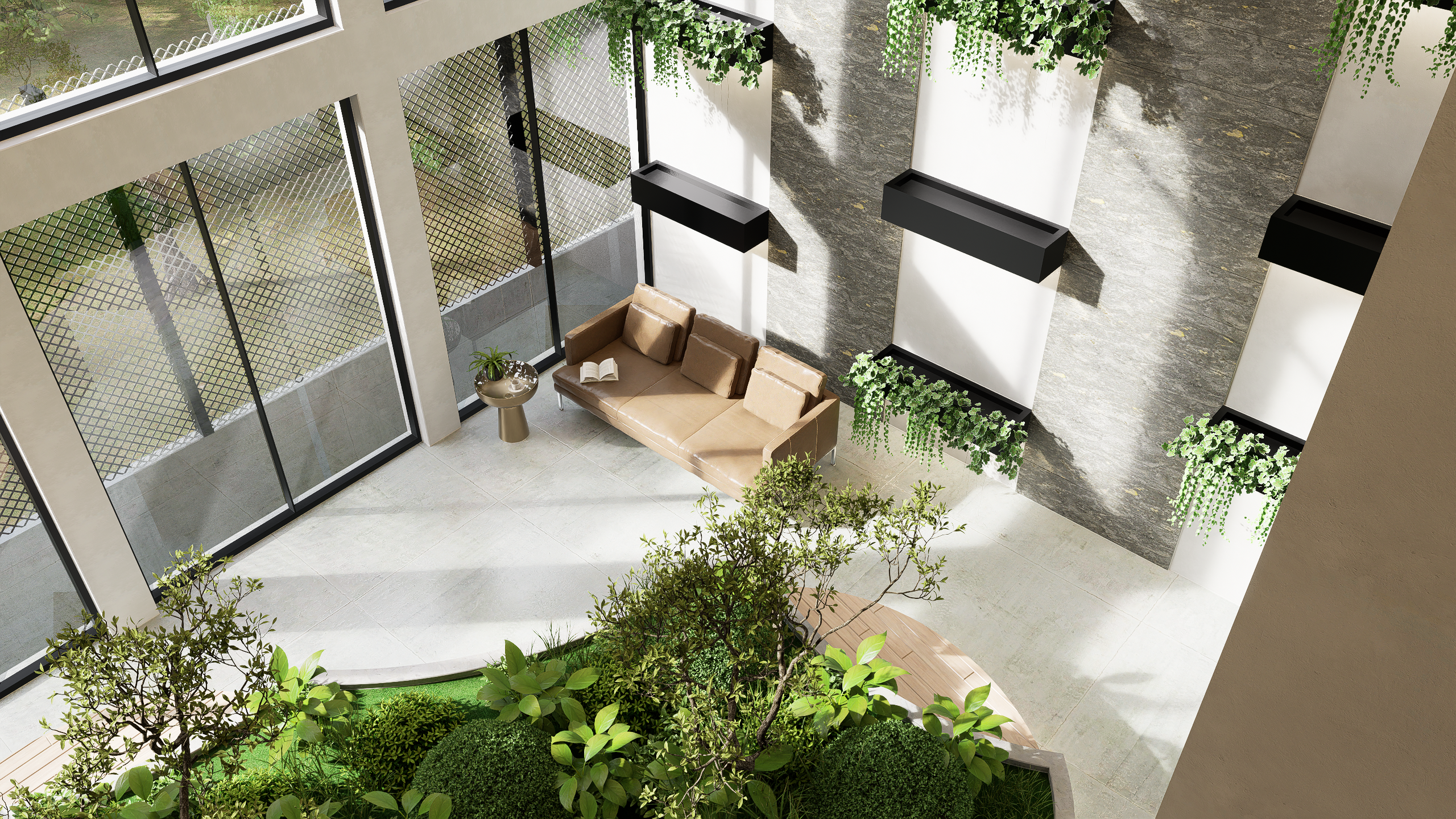 Materialidad, funcionalidad: Uso de materiales que combinan una estéticamoderna, la practicidad y bajo mantenimiento,aportando así sofisticación al diseño.